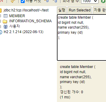 엔티티를 만들긴 하지만 아직까지 실습 단계에선 테이블까진 만들어주진 않는듯. 테이블은 직접 db에 들어가서 create로 만들어준다.