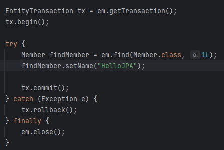 조회, 수정 및 삭제도 물론 가능하다. 여기서 jpa의 진가가 보이는데, 이 jpa의 목적은 sql 안의 내용을 자바의 객체처럼 다루고자 하는게 목적이기 때문에 엔티티 메니저에서 꺼낼 때 자바 클래스를 다루듯 수행하면 된다. 특히 자바 다루듯이 하려고 수정할 때 commit을 안해도 변경사항을 알아서 추적해서 만약 트랜잭션이 끝났을 때 변경사항이 있으면 알아서 바뀌도록 해놓았다.