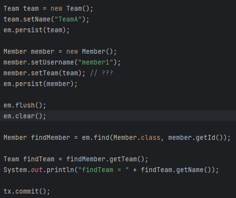 그래서 db에 바로 업데이트 안하고 1차 캐시에 저장해서 sql문 모아놓았다가 적용하는 방식에서 문제가 발생한다. 1차 캐시는 실제 자바 list 딕셔너리 쓰는거라 없으면 member는 team이 있는데 team의 member 리스트에는 없는 문제가 진짜로 발생한다. 위에서 되었던건 flush, clear해서 있는것.