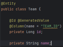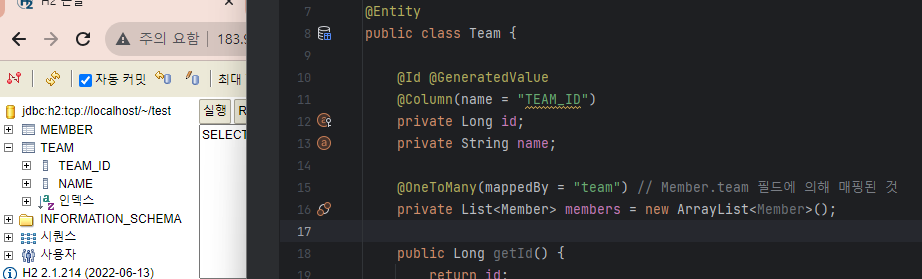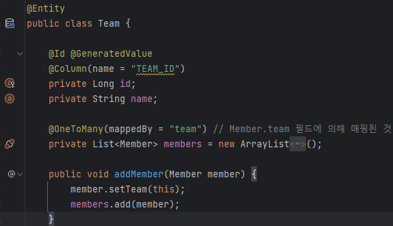 이따 설명하겠지만 실제로 team에서 member를 참조하기 위한 변수를 생성한 뒤 주인을 정해두면 db상에선 아무일도 일어나지 않는다. 참고로 mappedBy가 없으면 db가 정말 양쪽에서 수정이 가능해야 해서 이를 위한 테이블이 하나 생성됨.