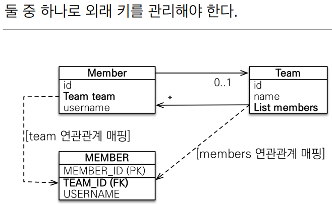 jpa를 진짜로 잘하는 사람은 어떤 객체를 주인으로 할 것인지 괜찮지만, 추천하는 방식은 왜래키를 가지고 있는 애를 주인으로 할 것. 이유는 키를 직접 가지고 있어 직관적인 것도 있지만 외래키를 가지고 있는 애가 보통 ManyToOne에서 Many쪽이기 때문도 있다.