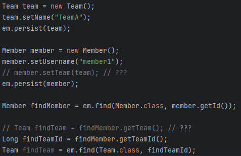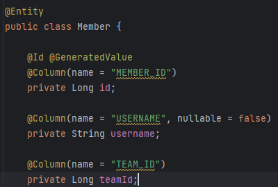 어쨌든 연관관계가 없는 이 상태로 멤버가 어떤 팀에 속하는지를 보는 코드를 짜려면 id를 찾아서 find를 해줘야 하는 번거로움이 있다. 데이터 지향적이라 이러는 것.