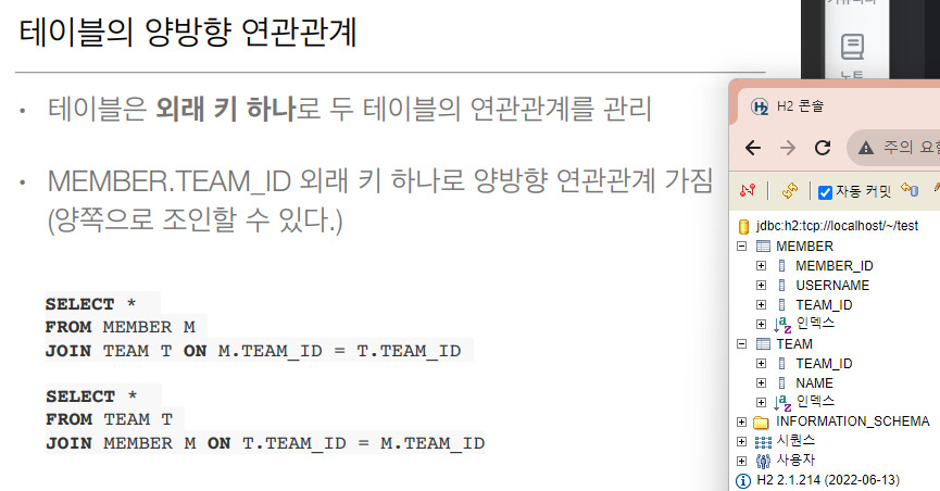 사실 db에서는 단방향 양방향 이런 개념이 없다. 그냥 연결 하면 연결 되는거고 아님 마는거고 하는 것. 즉 양방향이네 뭐네 하는건 자바 객체 관점에서 알기 쉽게 접근 정리 개념을 정의하려고 그런거지 db는 그냥 외래키를 하나라도 가지고 있으면 join을 양쪽에서 동시에 가능하다.