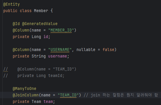 실제로 자바에서 객체 매핑(연관관계 매핑)을 하든 말든 데이터 중심 접근을 했던 것 처럼 아이디를 똑같이 가지고 있을 뿐이고, 편리 기능으로 @JoinColumn으로 알아서 join하도록 했을 뿐이다. 그래서 이름을 어디랑 매핑할 지를 정해야 했던거고.