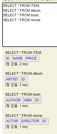 일단 이렇게만 하고 돌려보면 jpa의 기본 전략은 한 테이블에 다 때려박는 단일 테이블 전략인걸 알 수 있다.