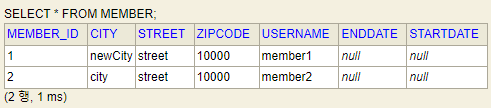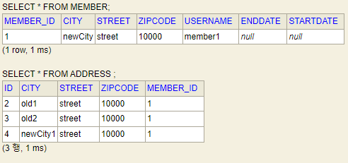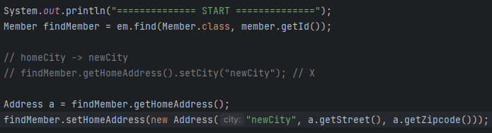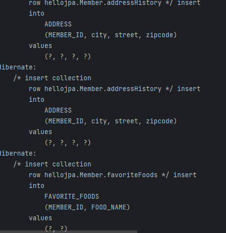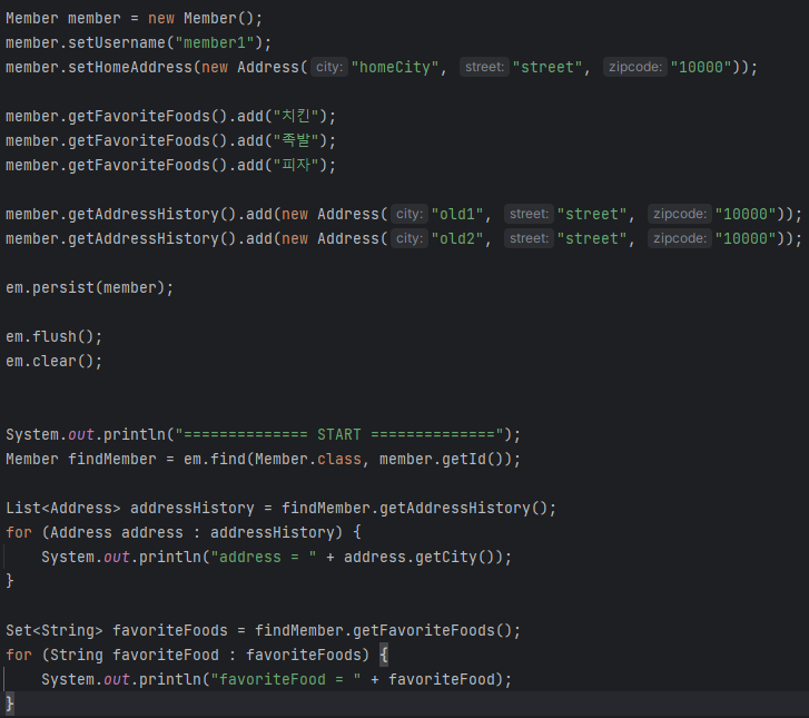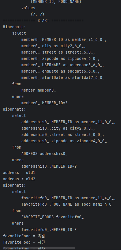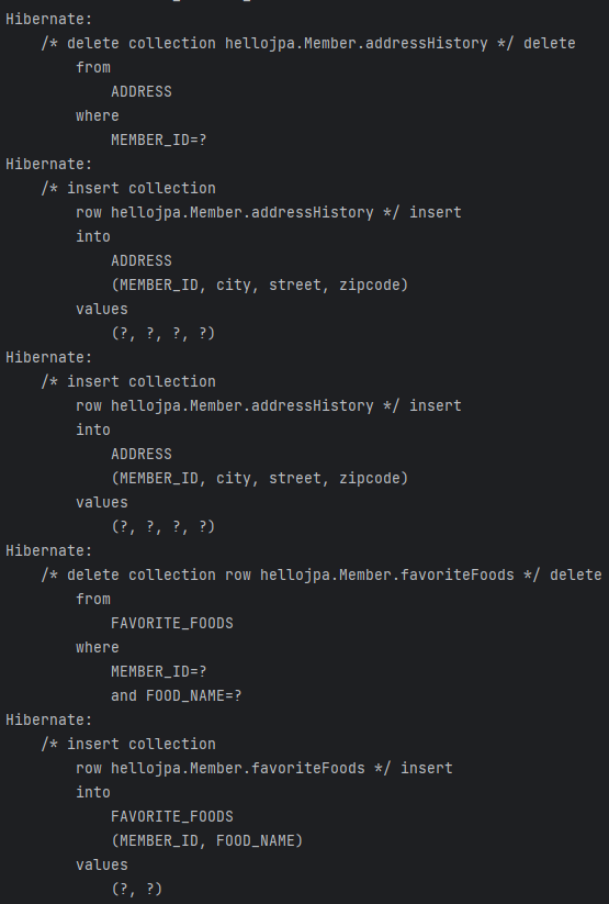문제는 삭제할 때. 여기서 값 타입 컬렉션 쓰지 말고 엔티티로 승격시켜서 쓰라고 얘기할건데 일단 삭제 및 다시 다른걸 추가할 때 어떻게 되는지 보자.