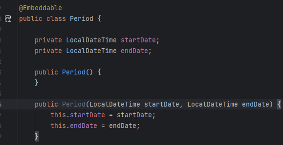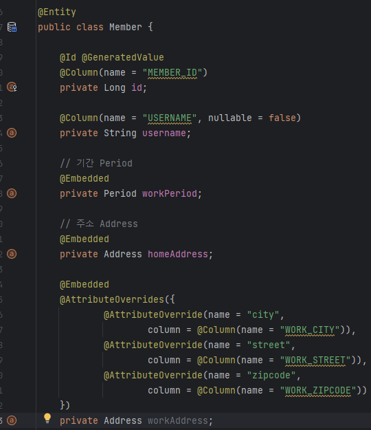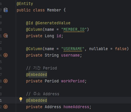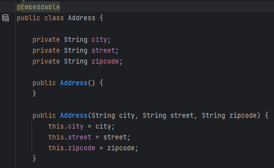 자바 객체 적으로는 하나로 묶어서 하고 싶을 때가 있다. 하지만 jpa는 기본 자바 타입들만 알아들어서 ORM할 때 알맞게 타입을 맞출텐데, 내가 막 만든 클래스는 타입이 있을리가 없으니 에러가 뜬다. 이걸 @Embeddable이나 @Embedded를 사용하여 알려주는 것. 테이블 안에는 똑같은 값이 들어가지만, 자바 객체적으로 분리했기 때문에 유지보수하기 더 좋고 특히 안의 함수들도 따로 만들 수 있어 더 좋다.