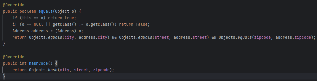 equals와 hashCode를 override 하지 않으면 얘도 객체 주소값을 비교해서 false가 뜨지만 클래스 안에 있는 각 속성값들을 비교하도록 override해서 바꾸면 된다.