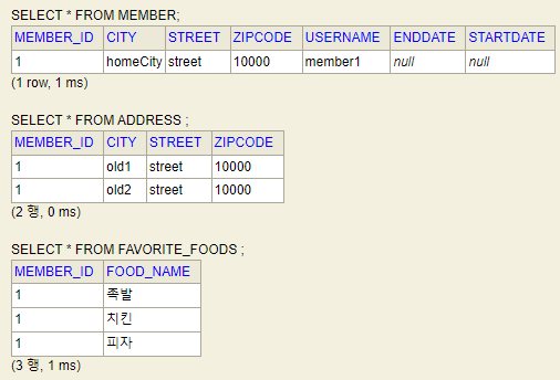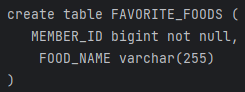 컬렉션으로 타입을 저장하면 전에 했던 엔티티를 @OneToMany로 컬렉션을 저장했던 것 처럼 타입들도 테이블을 나눠 저장한다. 다만 전에 했던 cascade와 orphanRemoval = true로 했던것처럼 라이프 사이클은 동일하지만 어차피 자신의 id값을 넣어서 where로 불러오는 형식이니 독점적으로 소유할 필요는 없다.
