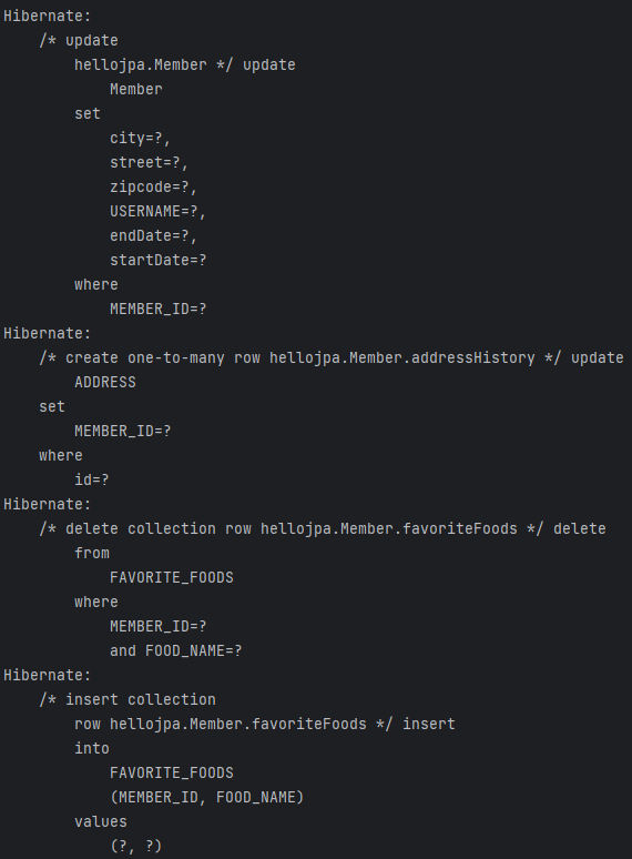 왜 이렇게 되느냐?? 그건 값 타입 컬렉션은 엔티티가 아니라 추적이 불가능하기 때문. 그래서 뭔가를 수정하려고 해도 추적하면서 가지고 있는게 없으니 모두 다 지우고 새로 하고 하는 방법밖에 없는것이다. 막 order 속성 어쩌구 넣으면서 어떻게든 할 수는 있지만.. 이 정도면 설계가 잘못된 것이기에 이 값 타입 컬렉션 대신 전에 배운 @OneToMany를 이용하여 엔티티를 새로 만든다. 이를 승격시키는 거라고 함.