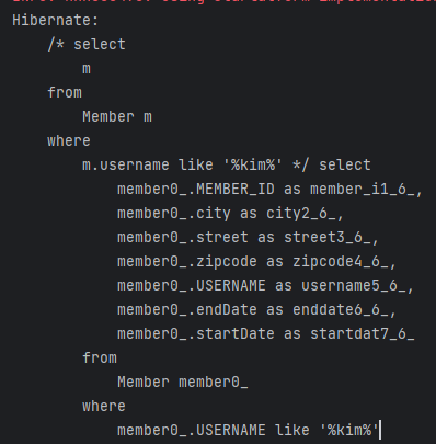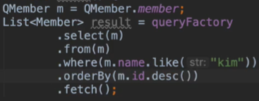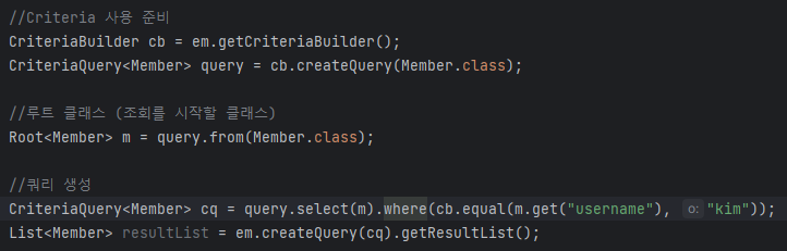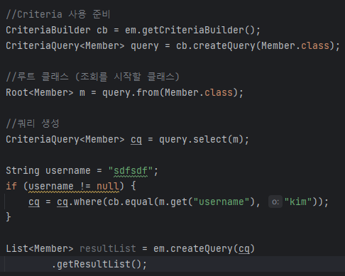 위 jpql의 경우 쌩 string을 넣기 때문에 동적 쿼리가 힘듬. 그래서 criteria라고 공식으로 지원하는 스펙이 있고, 자바 코드로 짜기 때문에 문법 오류 잡아주고 동적쿼리 하기 쉽고 하다는 장점이 있지만 진짜 뒤지도록 복잡하다.. 걍 안쓴다.