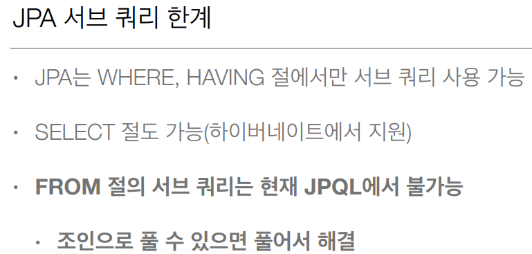 from절 서브 쿼리를 안써도 보통 select 절의 서브 쿼리로 해결할 수 있고, 정 안되면 네이티브 sql을 쓰던가 sql문을 2번 사용하던가 하면 된다. 이것마저도 안되면 그냥 가져와 서버단에서 처리해도 되고. 사실 하이버네이트 6부터는 지원한다.