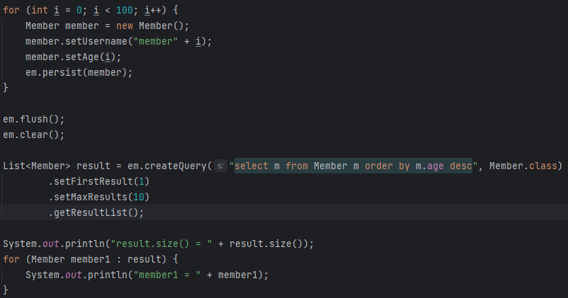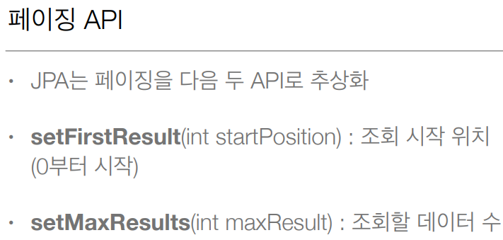 페이징 API는 이 페이징을 위한 sql코드라는게 각 db마다 달라가지고 막 머리빠져서 추상화해서 사용할 수 없을까 해주는걸 jpa가 해준거. setFirstResult로 offset을 설정하는 것과, 어디까지 가져갈지 setMaxResults 2개만 하면 자기가 각 db 방언들로 알아서 번역해서 해준다.