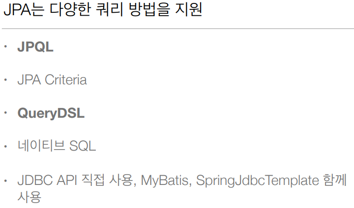 다양하게 있는데 진짜 왠만하면 JPQL, QueryDSL로 대부분 해결되고 진짜 안되는게 있을 땐 SpringJdbcTemplate로 해결한다. 거의 무조건 QueryDSL 사용을 추천.