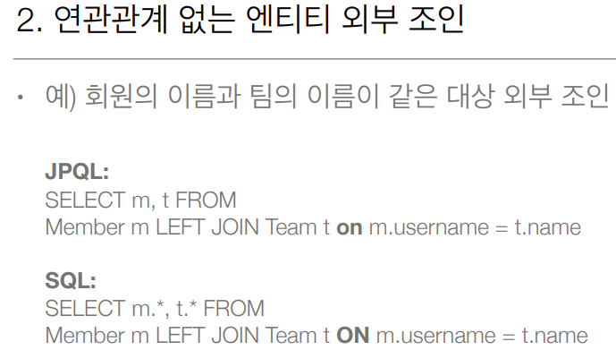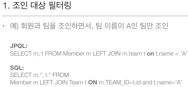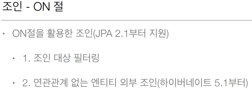 jpa 버전이 업 되면서 추가 가능 2가지를 제공하는데, 조인 할 대상에 이미 필터링을 한번 한 뒤 조인하는 것. 그래서 성능을 향상시킬 수 있고 연관관계가 없는 엔티티도 외부조인 할 수 있다.