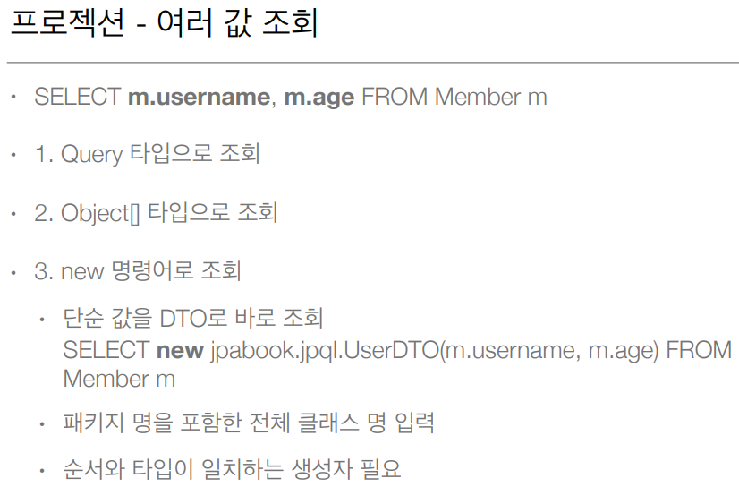 스칼라 타입 프로젝션이든 select해서 여러개 받는 방법은 또 방법이 여러개 있다.