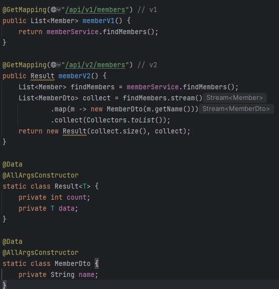 response로 응답해주는 부분인데 엔티티 자체를 반환하지 말고 일일이 응답용 dto를 만들어 사용하라는 모습. 안 그러면 필요 외에 개인적인 정보들도 유출될 수 있다. 거기다 dto를 사용하여 더 추가적인 정보들도 쉽게 줄 수 있다.