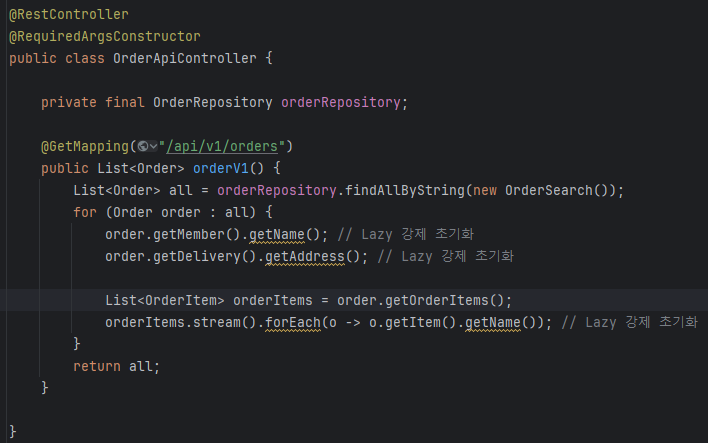 orderItems가 null이 나왔는데 지연 로딩이라 안불러와서 그렇다. 하나하나 불러와주는것도 넣어주고 다시 해보면 잘 나온다.