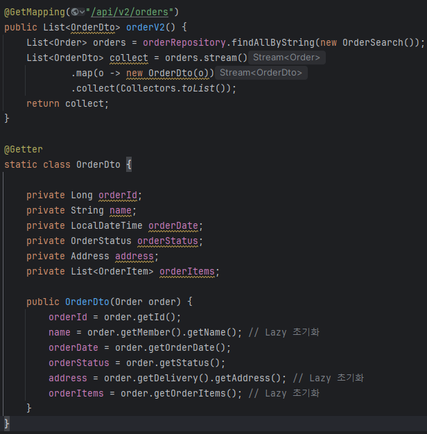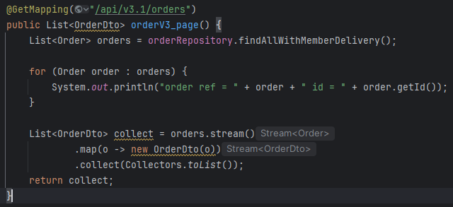 근데 문제는 사실 저것도 엔티티 그대로인 것이다. 즉, 겉은 dto로 바꿨는데 안은 엔티티를 반환하고 있는것.