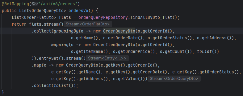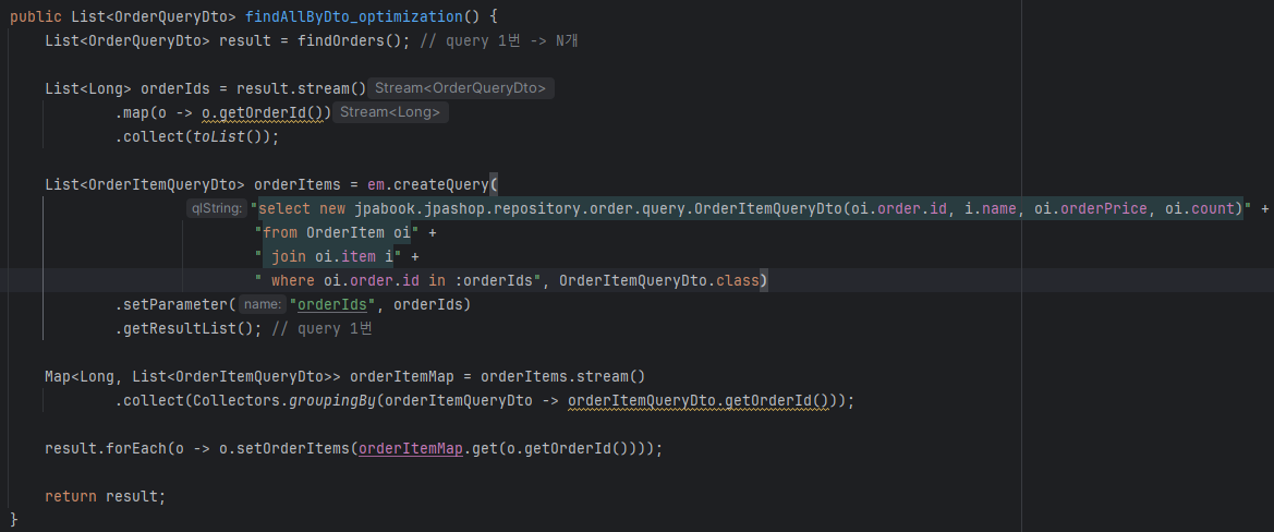 result에서 컬렉션 부분은 일일히 가져오는거에 주목. 여기서 N+1 문제가 생긴다.