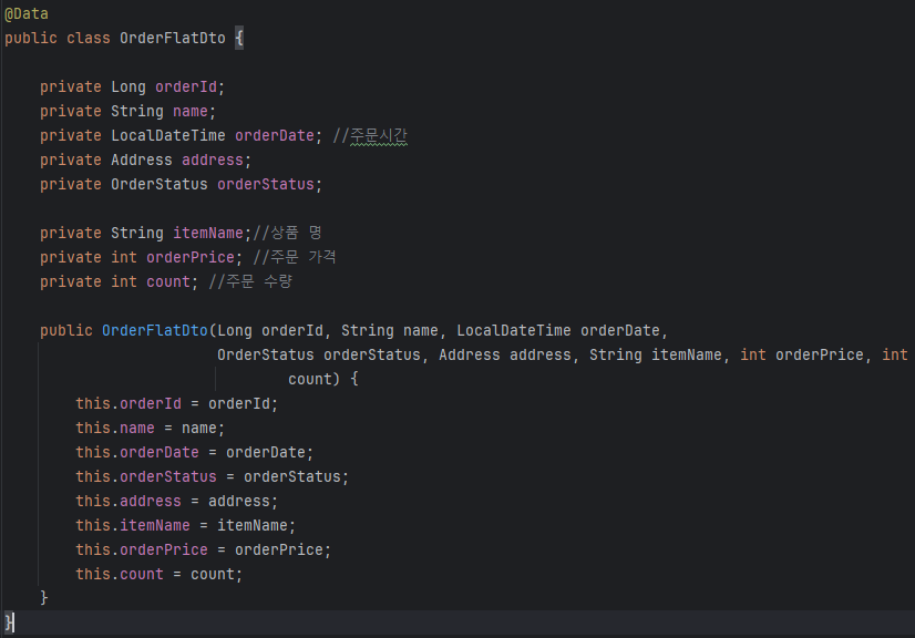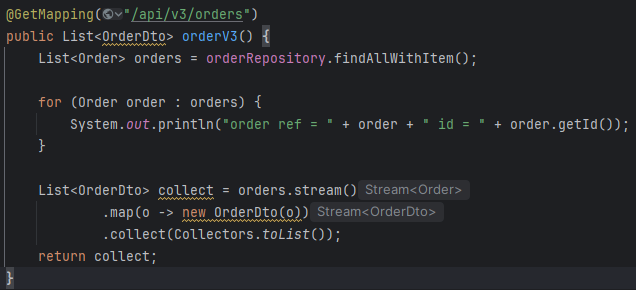 근데 문제는 사실 저것도 엔티티 그대로인 것이다. 즉, 겉은 dto로 바꿨는데 안은 엔티티를 반환하고 있는것.