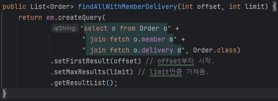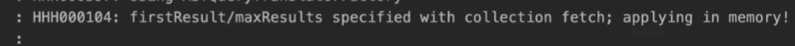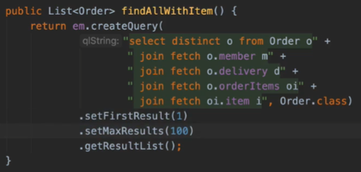 실제로 페이징을 시도하려고 setFirstResult와 MaxResults를 사용하려고 하면 sql에선 뭐 limit 이런거 없이 그대로 쓰고 메모리에 일단 다 가져와 페이징을 하기 때문에 메모리가 초과될 수도 있다는 경고 문구를 띄운다. 안되는 이유는 distinct를 쓰든 어쨌든 db에서 나온 결과는 그대로이기 때문에 db에서 중복 처리를 할 수 없기 때문이다.