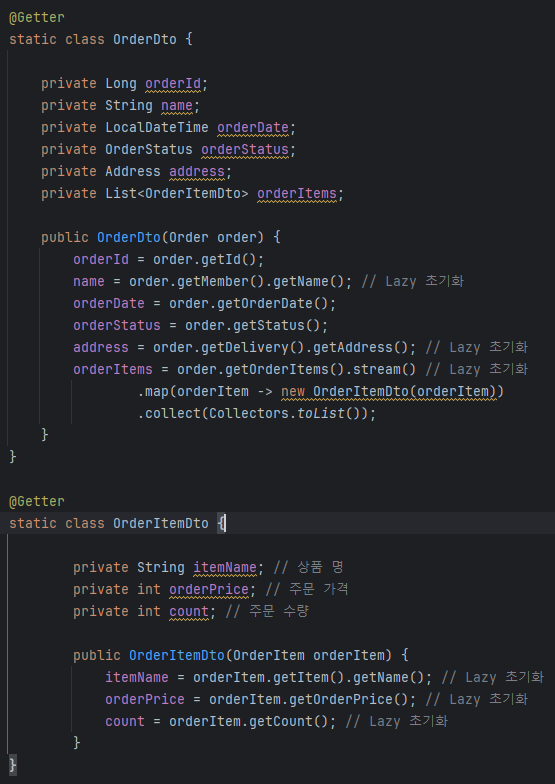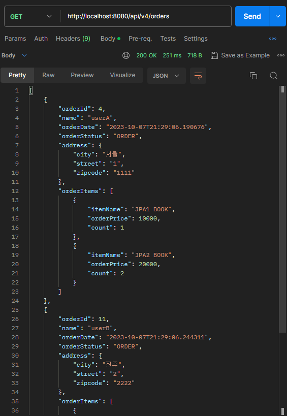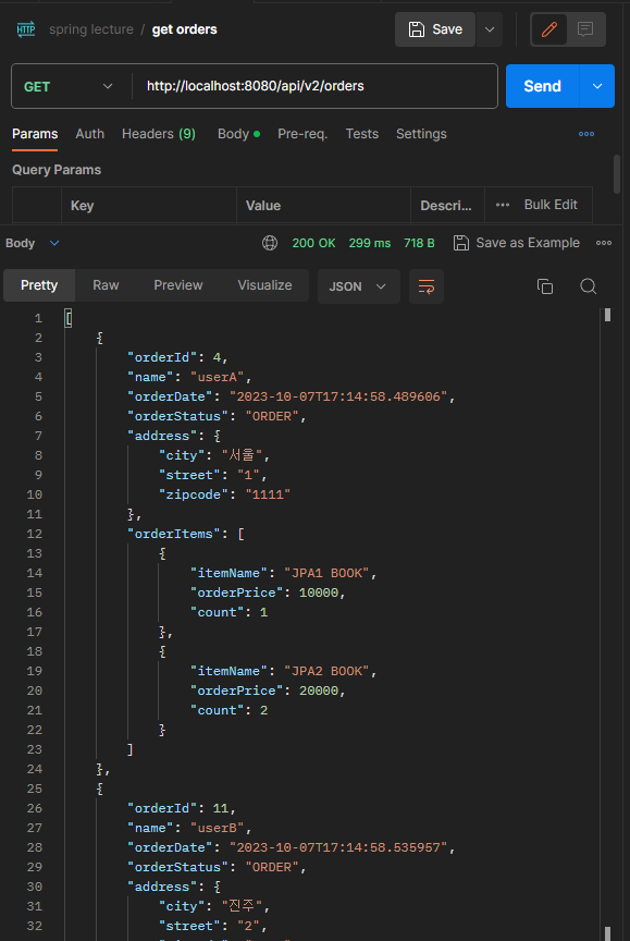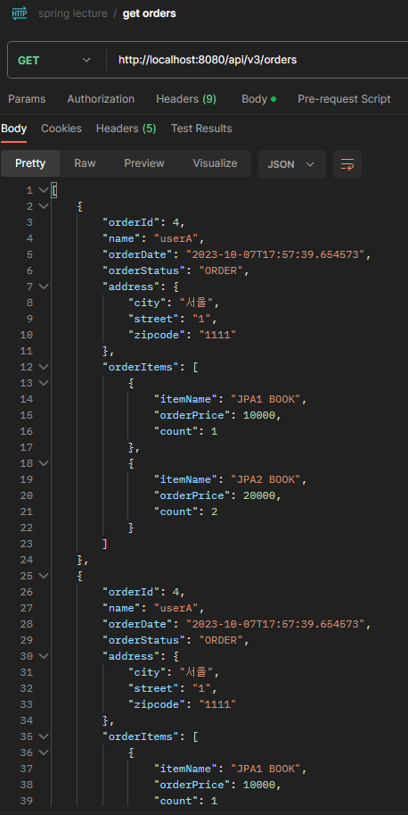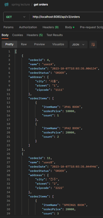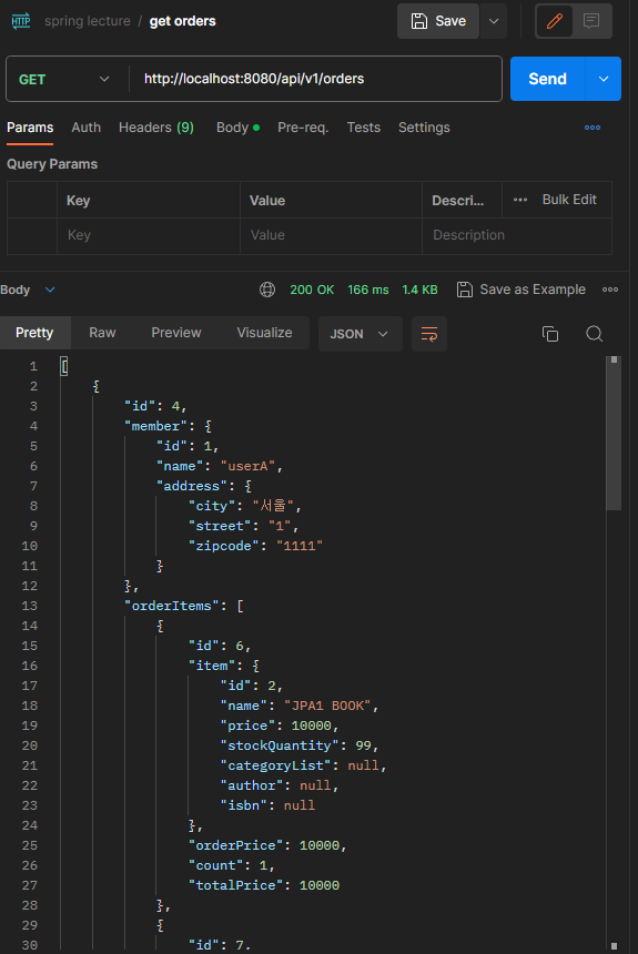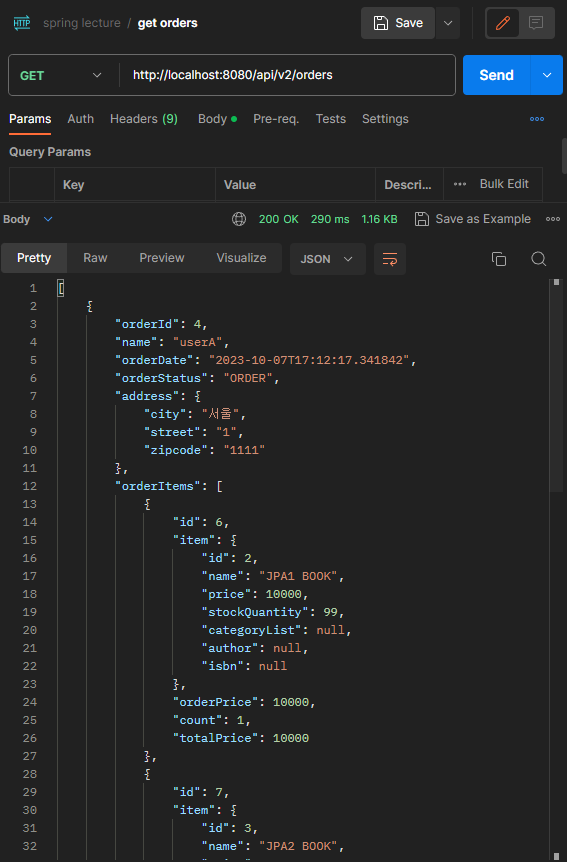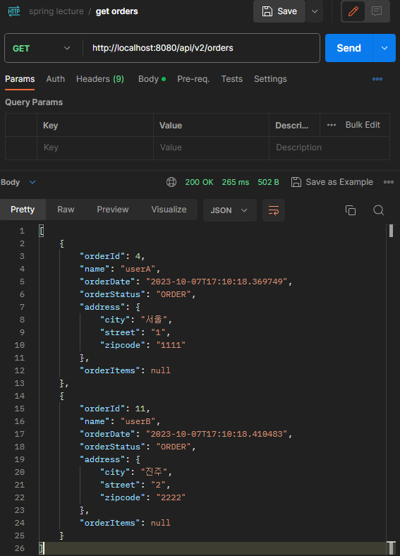 orderItems가 null이 나왔는데 지연 로딩이라 안불러와서 그렇다. 하나하나 불러와주는것도 넣어주고 다시 해보면 잘 나온다.