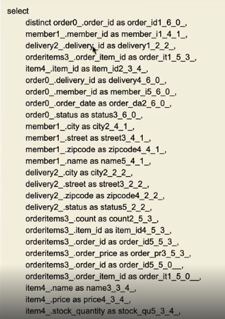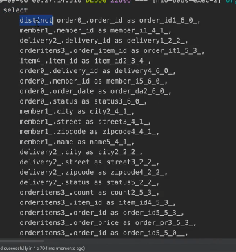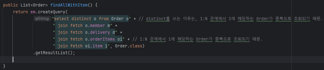 이를 해결하려면 distinct를 사용하여 중복을 제거한다. 사실 db에서는 완전 중복이 아니면 그대로라 db에서의 갯수는 여전하지만 distinct를 사용함으로써 hibernate에게 중복이 있으면 제거하라는 의도를 주었기 때문에 자기가 제거한다.