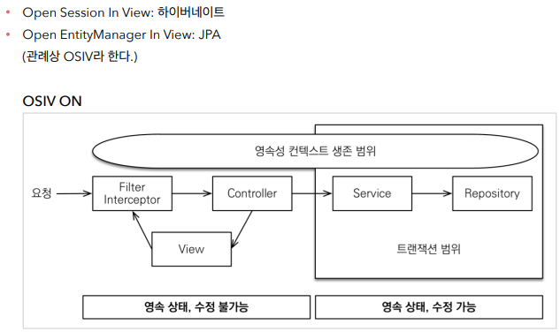 OSIV는 open session in view의 줄임말인데, 영속성 컨텍스트 즉, db 커넥션이 언제까지 살아있게 할거냐를 결정한다.