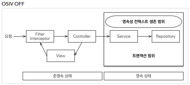 즉 OSIV를 끈 상태라면 @Transactional 안에서 모든 수정작업을 거치고 모든 지연 조회를 fetch를 통해서든 다 가져와야 한다.