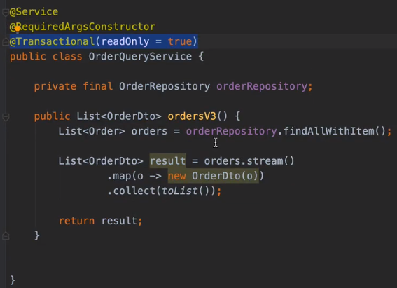 추천하는 작성방법은 이런 비즈니스 로직적으로 필요하다기 보단 화면으로 뿌려주는 데에 집중하는 쿼리서비스를 따로 만들고 여기에서 @Transactional를 작성한다.