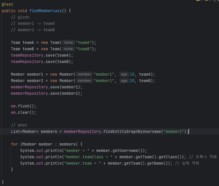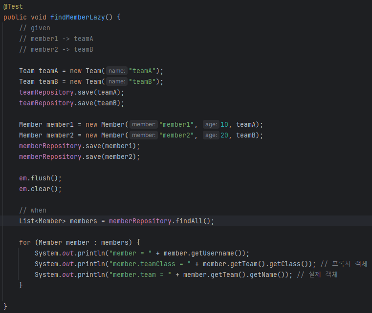 만약 lazy로 설정되어 있을 경우, 불러오라고 했을 때 실제로 한번에 join까지 해서 db에서 불러오는게 아니라, 가짜 프록시 객체를 가지고 있고 값을 요구할 때 그때서야 불러온다.