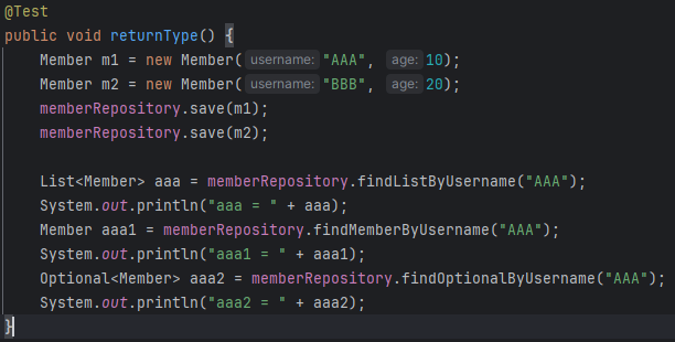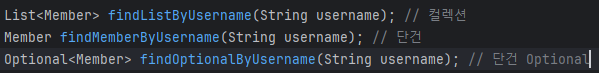 주의할 점은 만약 값이 없을 시, 각 반환타입에 따라 반환값이 달라지는데, List는 그냥 비어있는 list가 나오고, 단건은 null, Optional은 Optional.empty가 나온다. 많이 헷갈리므로 단건에서 값이 없을 수도 있는 경우는 Optional을 사용하자.