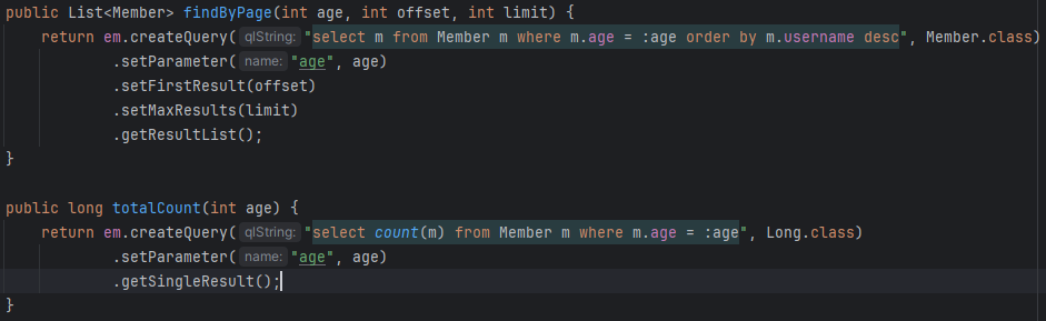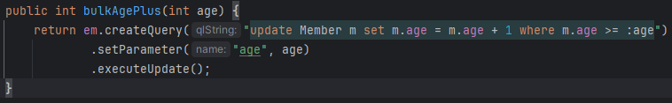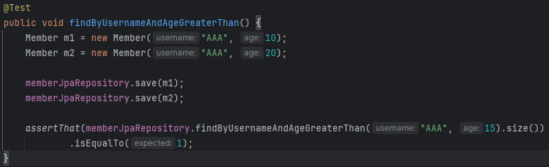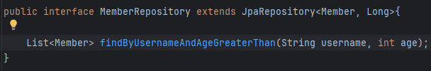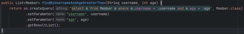 이름이 같고 나이는 어느 이상인 조건을 찾는 함수를 만든다고 하자. 정석은 EntityManager로 불러오는 것.