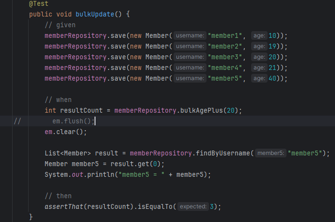 그럼 @Modifying 하고 @Query하면 다 끝나는게 아니냐? 싶은데 이런 벌크 연산은 영속성 컨텍스트에 저장해서 반영하니 마니 하는게 아니라 그냥 직접 db로 쏴주는거다 보니 한 트랜잭션 안에서 벌크연산 하나만 있는게 아니라 다른것도 같이 있다면 영속성 컨텍스트 안에 들어있는 내용까지 고려해야 한다. 벌크 연산 전 flush는 자동으로 되지만 clear는 안되서 벌크연산이 반영되기 전의 내용이 영속성 컨텍스트 안에 들어있다.