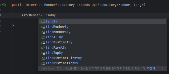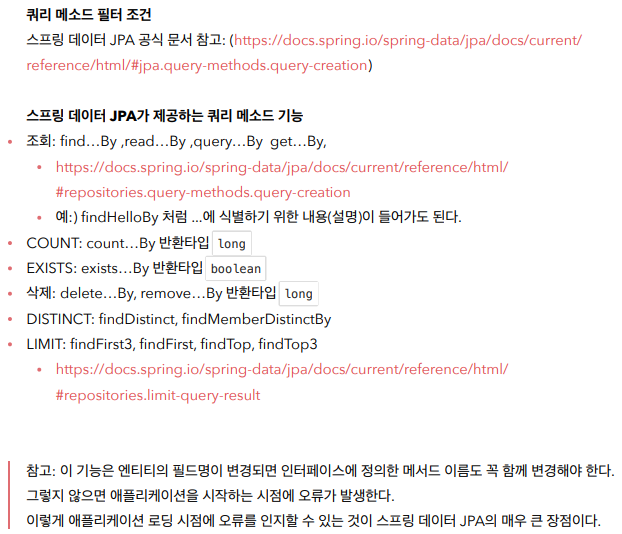 공통으로 있는게 들어있는건 알겠는데 내 앱이여서 내 도메인에 특화된 건 어떻게 하느냐. 즉, data jpa를 그대로 쓰고 여기에 나만의 커스텀 함수는 어떻게 만드느냐. 이게 쿼리 메소드 기능임.
