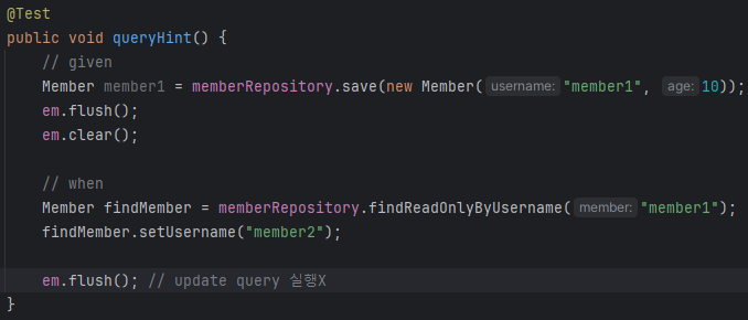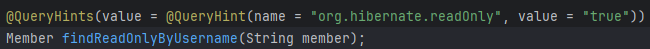 힌트는 진짜 변경 없이 100% 읽기만 하는거라는 확신이 있을 때 readonly로써 불러와 최적화 화는거다. 이러면 프록시 만들어서 추적을 할 필요 없으니 자원이 조금 줄어든다. jpa에선 지원을 하지 않고 hibernate에서만 자체적으로 지원하는 것.