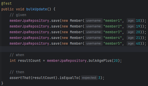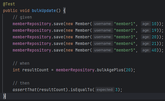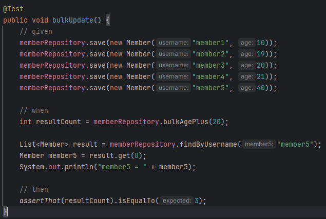 벌크 쿼리도 알아볼건데 벌크 쿼리는 모든 row애들 한번에 업데이트 하는거. 자바는 객체 중심이다보니 하나하나 해야하는 개념이라 직접 @Query로 만들어야 한다.