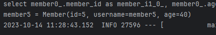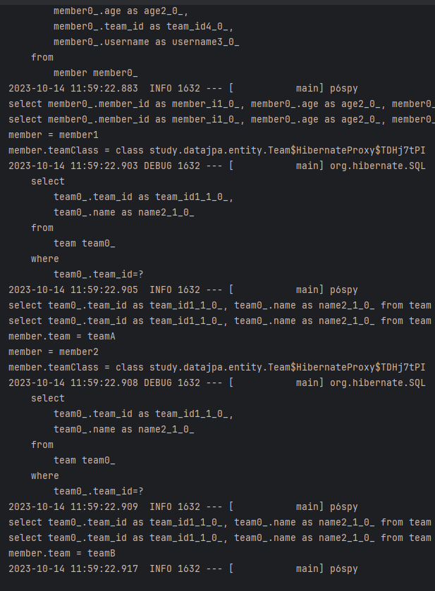 가짜 프록시 객체를 가지고 있고 요구하면 그때서야 where를 통해 해당 값을 가지고 오는걸 볼 수 있다.