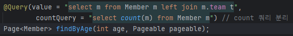 근데 이 카운트가 문제가 될 수 있는것이, 어차피 갯수 세는거는 join을 하든 안하든 결국엔 같을텐데 따로지정 안해주면 join을 한 뒤에 count를 하여 성능에 저하를 준다. 그래서 countQuery는 어떻게 해야할지 따로 설정할 수 있다.