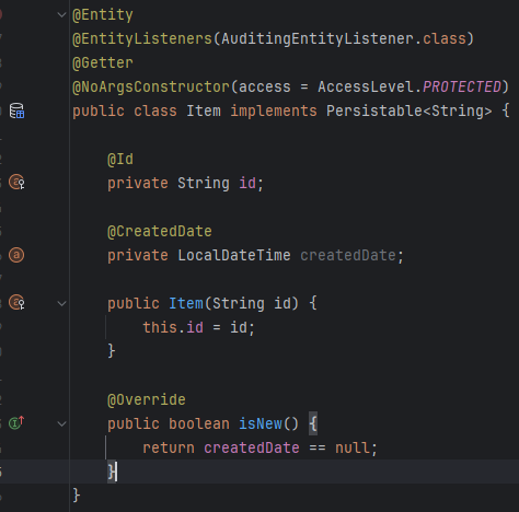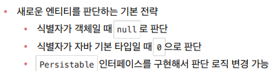 그래서 직접 지정하고 싶다면 @EntityListeners의 Audit를 사용하여 생성 날짜를 이용하는 방법을 추천한다. 이 엔티티가 새거인지 아닌지 판단을 id가 아니라 createdDate가 비어있으면 새거라고 판단하는 것이다.