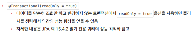 @Transactional은 만약 내가 @Transactional을 하고 들어가면 그대로 이어서 받아 들어가겠지만 내가 하지 않더라도 안에서 얘가 해주고 들어간다는 것. 좋은건 readOnly를 해서 flush를 하지 않기 때문에 성능의 이점을 더 얻으려고 하는 모습. 그래서 save는 readOnly를 안사용하기 위해 덮어씌운다.