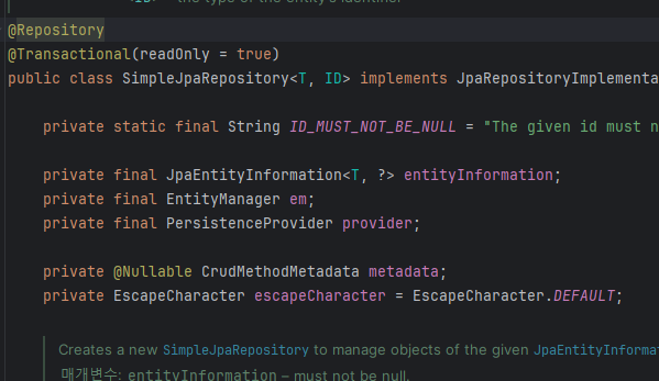 어노테이션이 @Repository와 @Transactional 두가지가 있는데 각각의 의미는 다음과 같다.