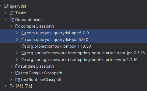 종속성 보면 qclass 만들어주는 apt 라이브러리와 실제 select등 함수 도와주는 jpa 라이브러리가 있다.