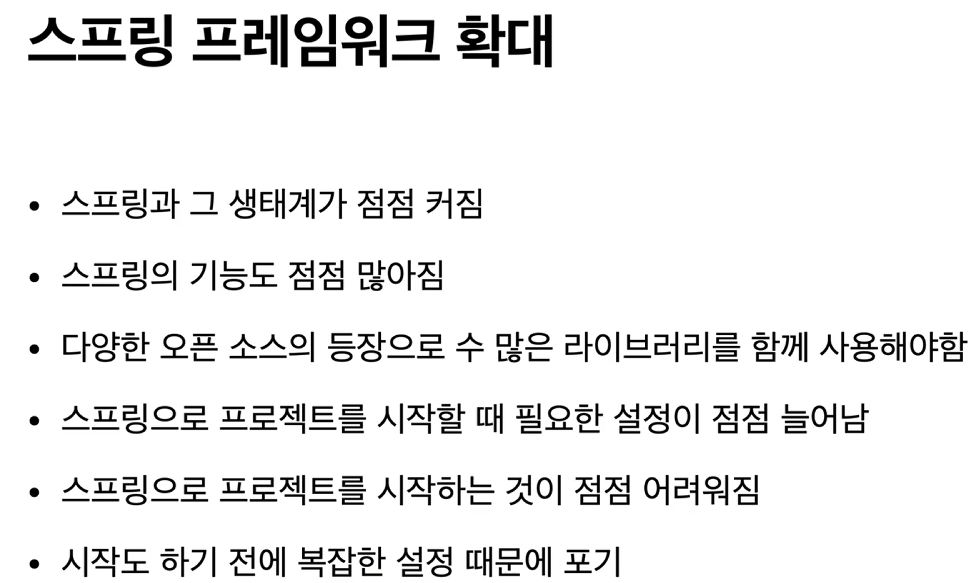 스프링 프레임워크는 좋으나 점점 살이 붙으며 설정 자체가 어려워지게된다.