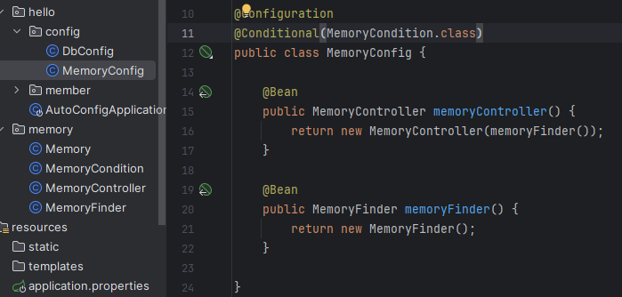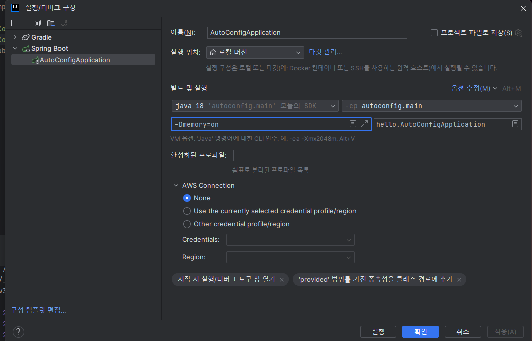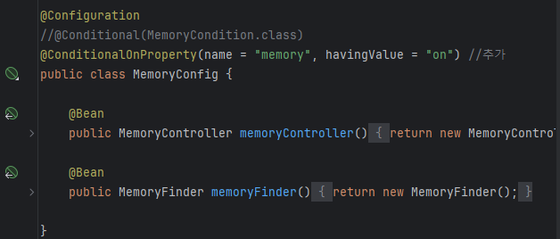 아까 만든 MemoryConfig에 @Conditional를 추가했다. 그리고 Condition조건 클래스에는 VM option으로 사용한다고 해야 사용 되도록 했다.