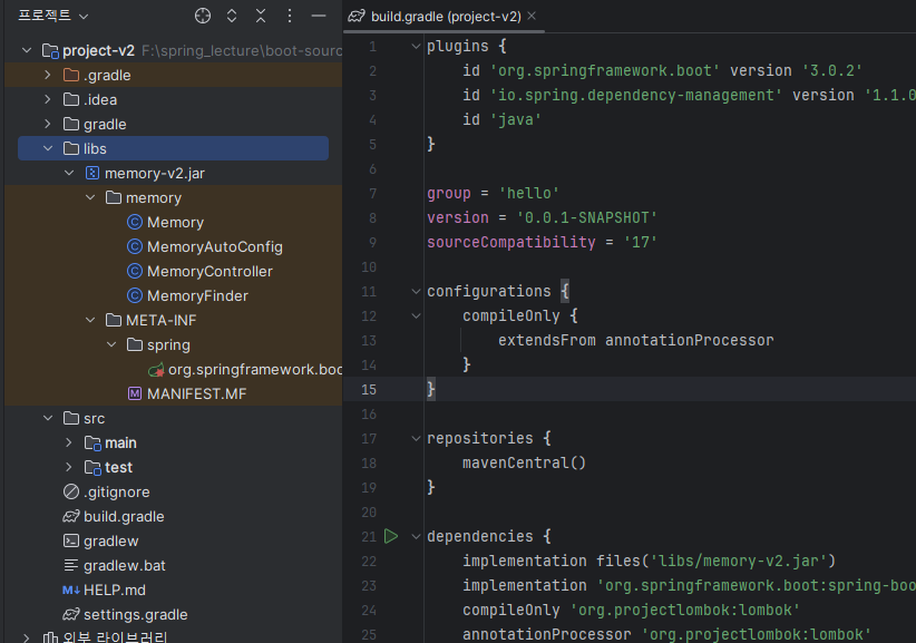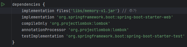 이 빌드된 걸 새로운 프로젝트에서 실행하려면, libs 폴더 만든 뒤 이 빌드해서 나온 .jar 파일을 넣고 설정에서 파일로 불러오면 된다.
