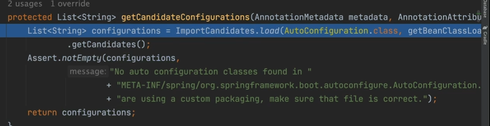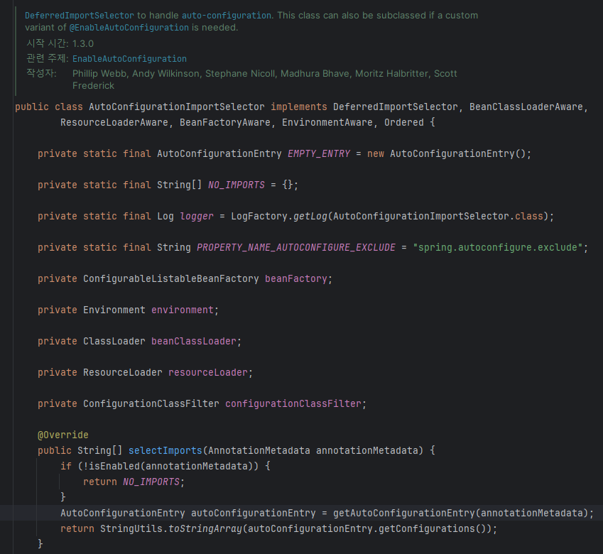 아까 봤던 AutoConfigurationImportSelector. 얘도 결국 아까 해봤듯이 selectImports에서 문자열 결과로 어떤 클래스를 자동으로 가져오는게 좋은지 내놓는 거고 실제 작동도 그렇게 한다.