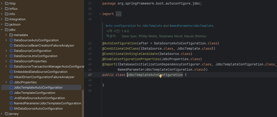 @ConditionalOnClass로 만약 내가 bean으로 등록한게 있으면 이걸 실행하지 않고 없다면 실행하여 충돌을 방지한다. 이것도 결국 new JdbcTemplate(dataSource)를 하는게 내가 한거랑 똑같다.