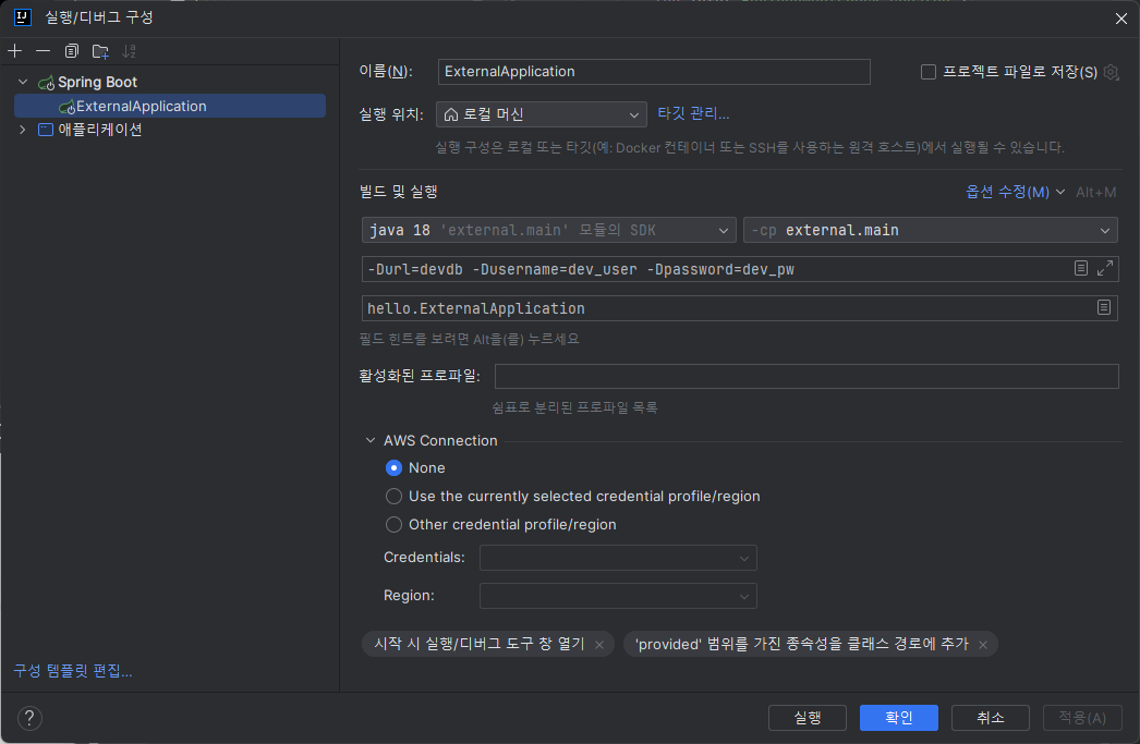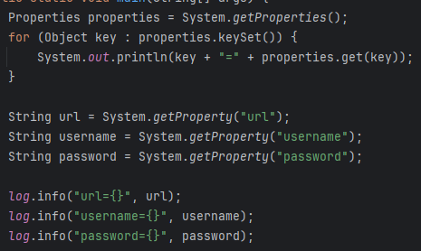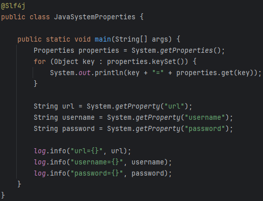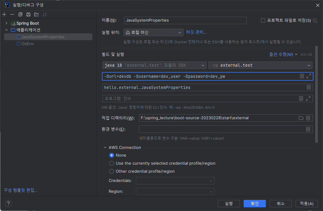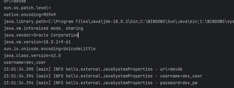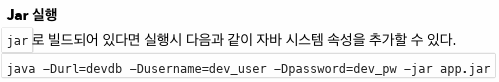 실행할 때 뒤에 -D~~~=~~~ 로 하여 JVM이 읽을 수 있는 변수를 정해줄 수 있다. 자바 안에서도 속성을 set로 정의할 수 있지만 외부에서 읽어오는걸로써 필요한건데 굳이 할 필요가 있을까?